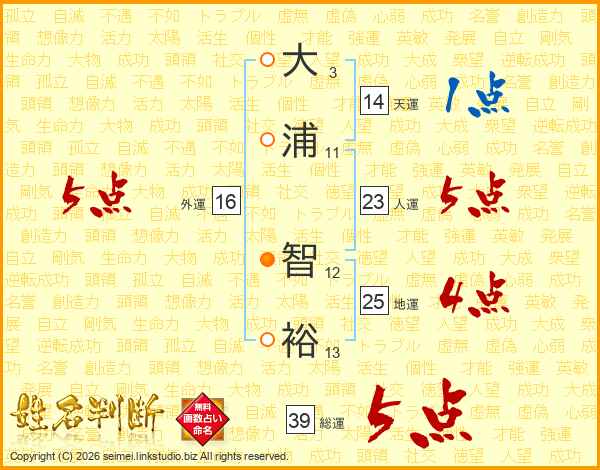 大浦智裕さんの総運は39画の5点!