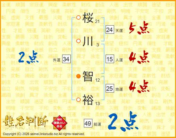 あなたの人生を表す1番重要な運勢です。生涯を通じて影響する総合運となり、主に50歳以降の晩年期に影響を及ぼします。苗字と名前の合計画数。