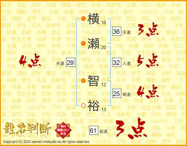 横(16画)瀬(20画) 智(12画)裕(13画)