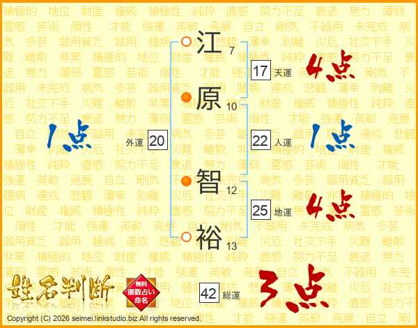 生活面を象徴する運勢です。外部から受ける影響力を表し、結婚運、家庭運や職場、環境への順応性を表します。総運から人運を引いた画数。姓や名が1文字の場合を除く。