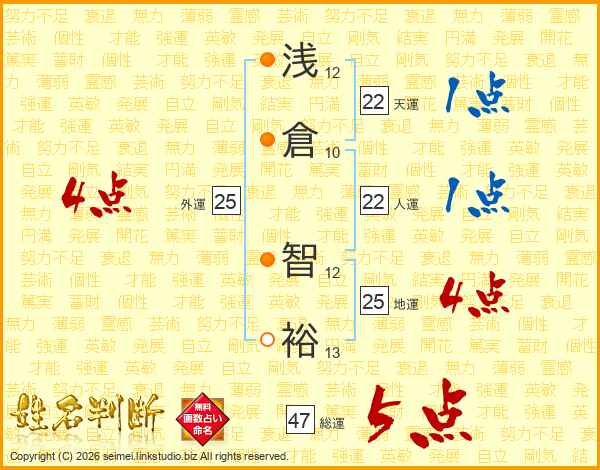 浅(12画)倉(10画) 智(12画)裕(13画)