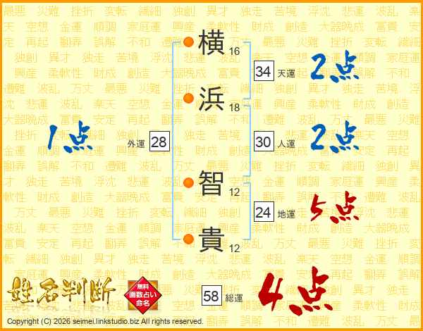 横(16画)浜(18画) 智(12画)貴(12画)