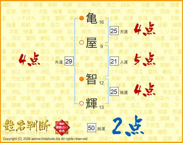 亀(16画)屋(9画) 智(12画)輝(13画)