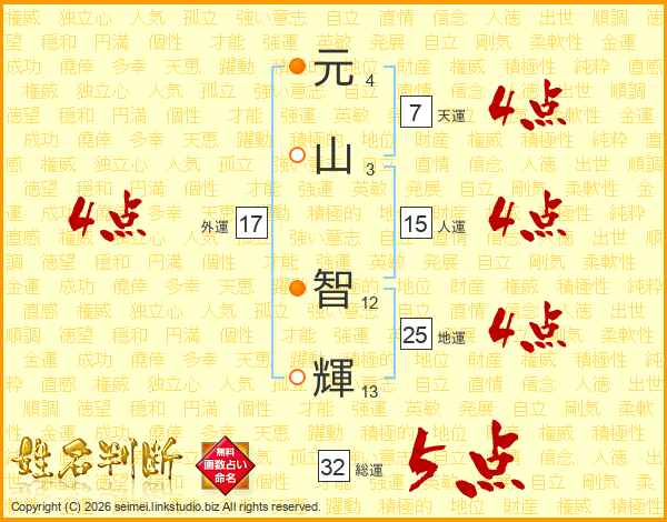 元(4画)山(3画) 智(12画)輝(13画)