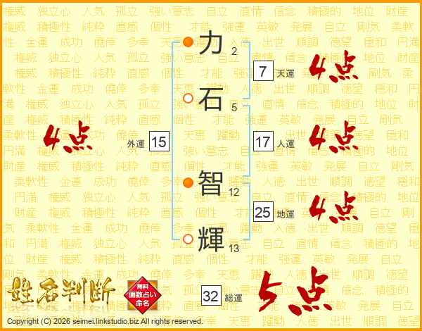 力(2画)石(5画) 智(12画)輝(13画)