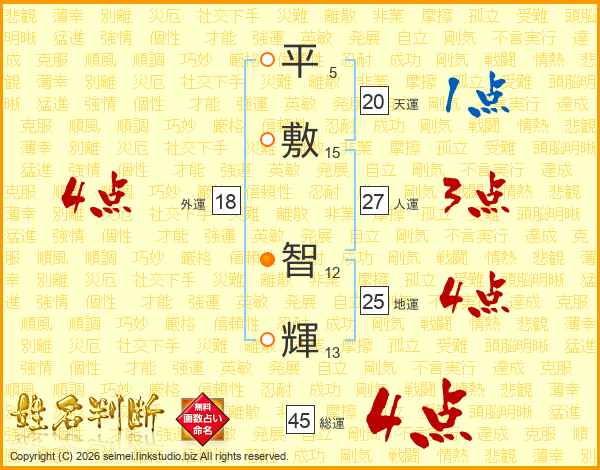 平(5画)敷(15画) 智(12画)輝(13画)