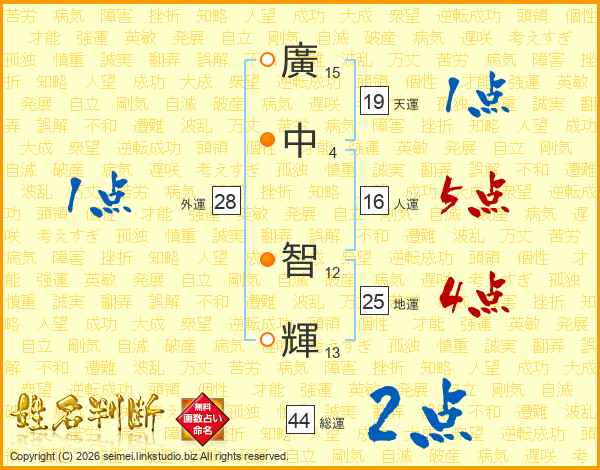廣(15画)中(4画) 智(12画)輝(13画)