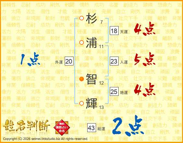 杉(7画)浦(11画) 智(12画)輝(13画)
