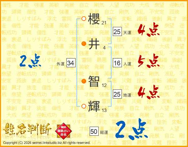 櫻(21画)井(4画) 智(12画)輝(13画)