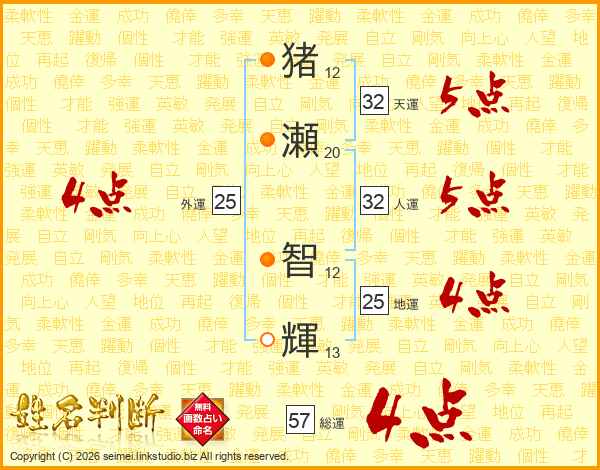 猪(12画)瀬(20画) 智(12画)輝(13画)