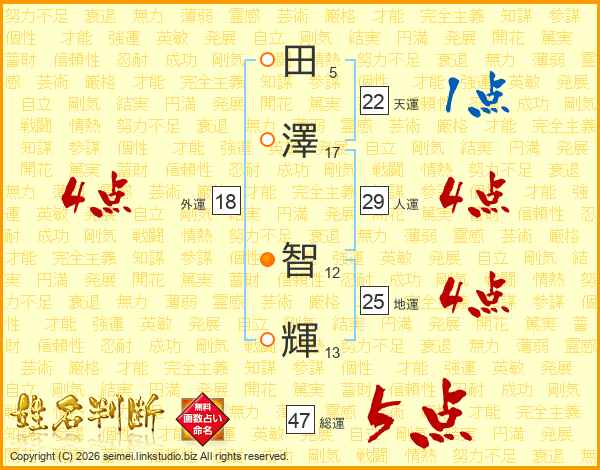 田(5画)澤(17画) 智(12画)輝(13画)