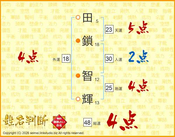 田(5画)鎖(18画) 智(12画)輝(13画)