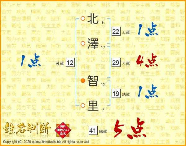 北(5画)澤(17画) 智(12画)里(7画)
