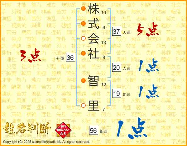 株(10画)式(6画)会(13画)社(8画) 智(12画)里(7画)