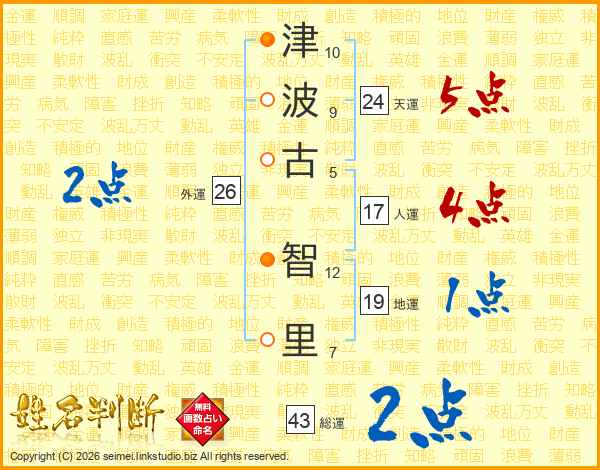 津(10画)波(9画)古(5画) 智(12画)里(7画)