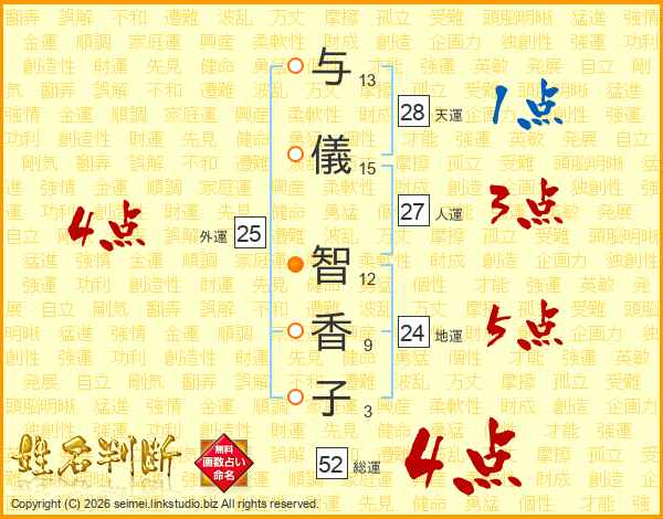 与(13画)儀(15画) 智(12画)香(9画)子(3画)