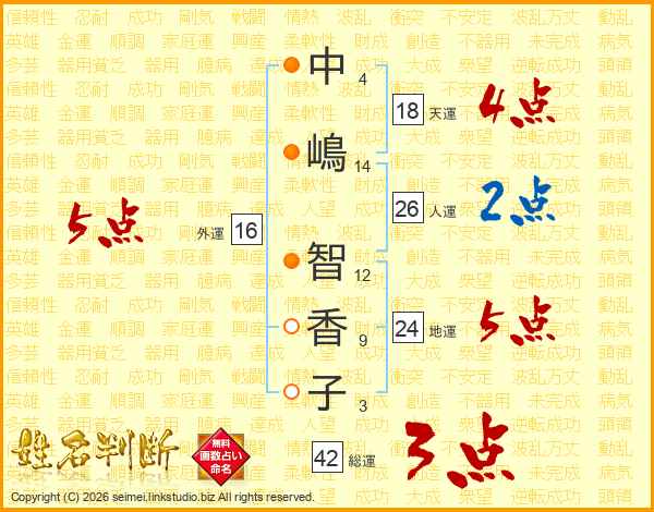 中(4画)嶋(14画) 智(12画)香(9画)子(3画)