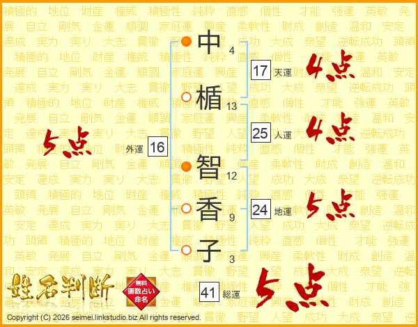中(4画)楯(13画) 智(12画)香(9画)子(3画)