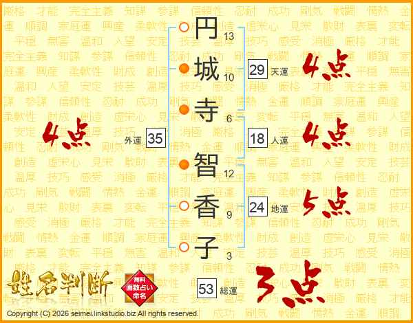 円(13画)城(10画)寺(6画) 智(12画)香(9画)子(3画)