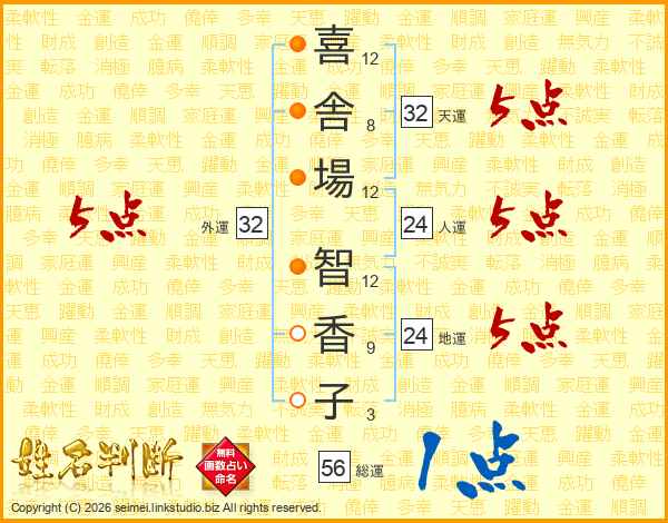 喜(12画)舎(8画)場(12画) 智(12画)香(9画)子(3画)