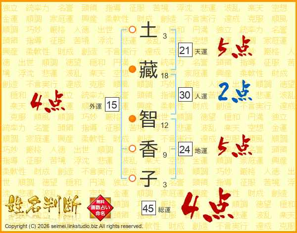 土(3画)藏(18画) 智(12画)香(9画)子(3画)