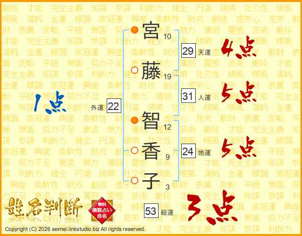 宮(10画)藤(19画) 智(12画)香(9画)子(3画)