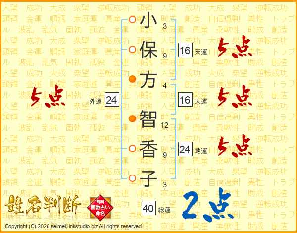 小(3画)保(9画)方(4画) 智(12画)香(9画)子(3画)