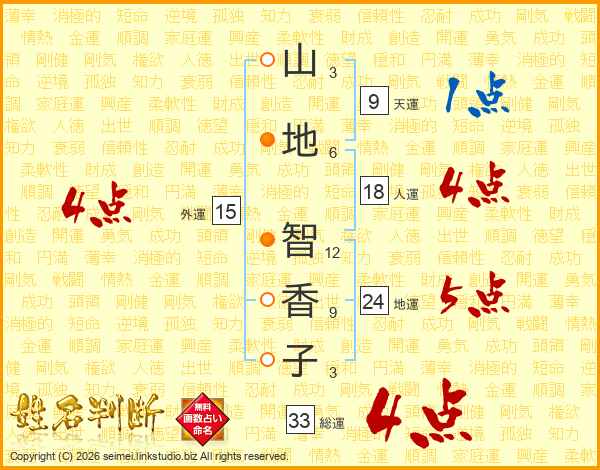 山(3画)地(6画) 智(12画)香(9画)子(3画)