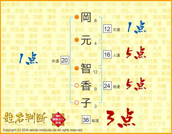 岡(8画)元(4画) 智(12画)香(9画)子(3画)