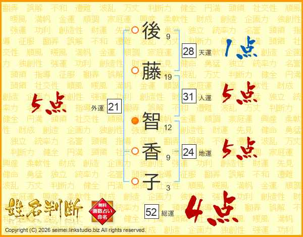 後(9画)藤(19画) 智(12画)香(9画)子(3画)
