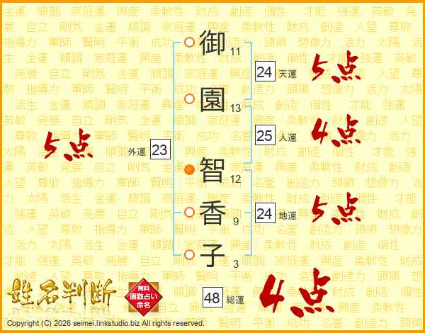 御(11画)園(13画) 智(12画)香(9画)子(3画)