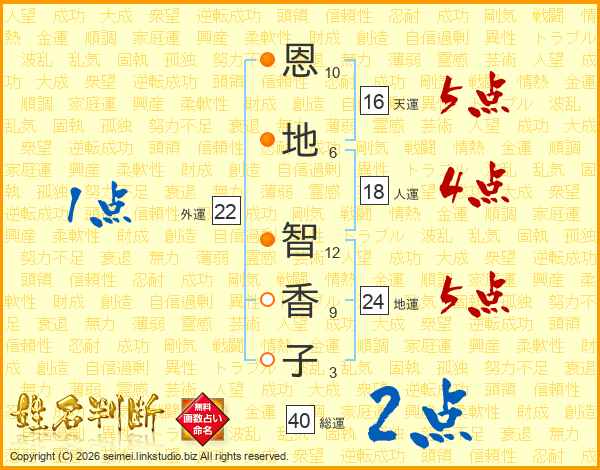 恩(10画)地(6画) 智(12画)香(9画)子(3画)