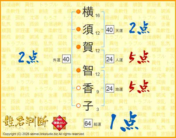 横(16画)須(12画)賀(12画) 智(12画)香(9画)子(3画)
