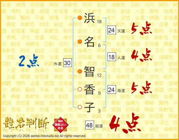浜(18画)名(6画) 智(12画)香(9画)子(3画)