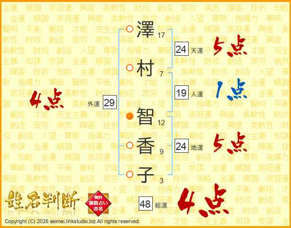 澤(17画)村(7画) 智(12画)香(9画)子(3画)
