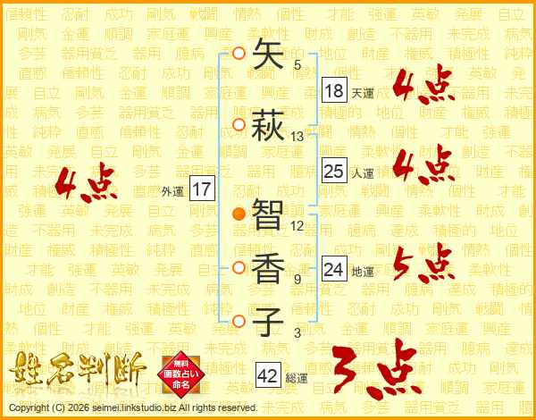 矢(5画)萩(13画) 智(12画)香(9画)子(3画)