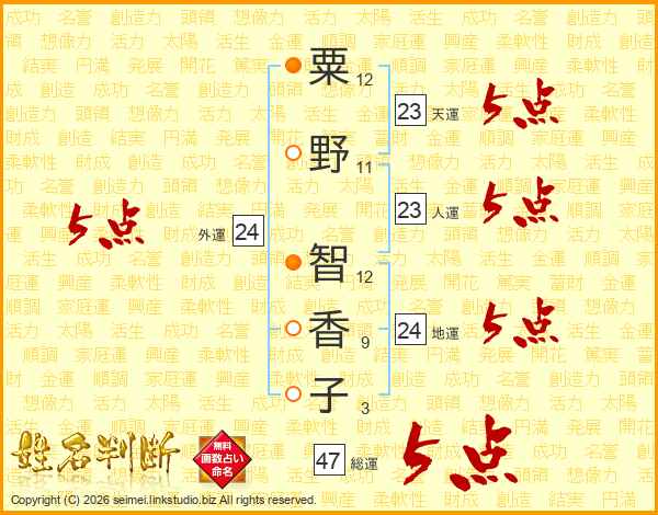 粟(12画)野(11画) 智(12画)香(9画)子(3画)