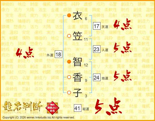 衣(6画)笠(11画) 智(12画)香(9画)子(3画)