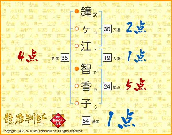 鐘(20画)ヶ(3画)江(7画) 智(12画)香(9画)子(3画)
