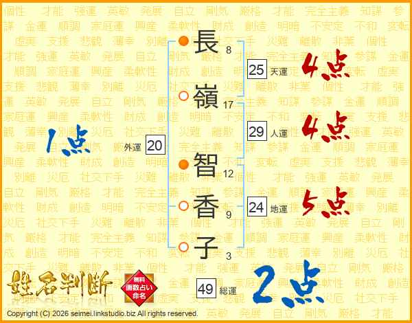 長(8画)嶺(17画) 智(12画)香(9画)子(3画)