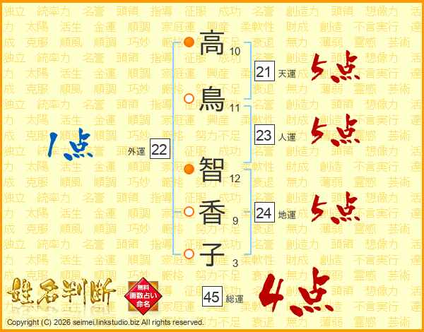 高(10画)鳥(11画) 智(12画)香(9画)子(3画)