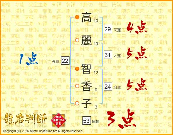 高(10画)麗(19画) 智(12画)香(9画)子(3画)