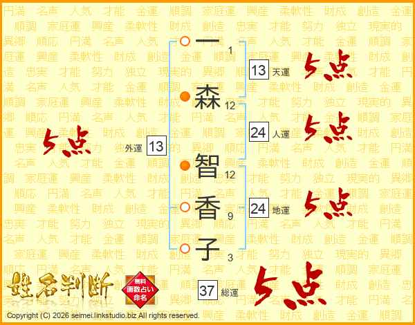 一(1画)森(12画) 智(12画)香(9画)子(3画)