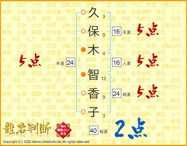 久(3画)保(9画)木(4画) 智(12画)香(9画)子(3画)