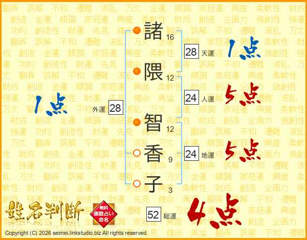 諸(16画)隈(12画) 智(12画)香(9画)子(3画)