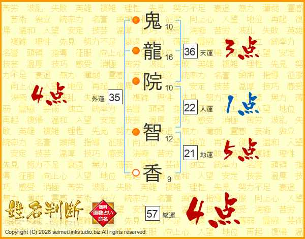 鬼(10画)龍(16画)院(10画) 智(12画)香(9画)