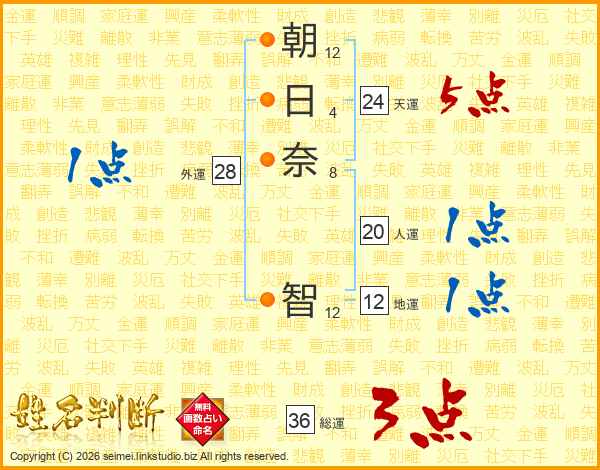 生活面を象徴する運勢です。外部から受ける影響力を表し、結婚運、家庭運や職場、環境への順応性を表します。総運から人運を引いた画数。姓や名が1文字の場合を除く。