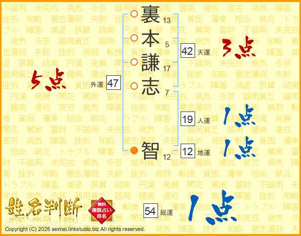 裏本謙志智さんの総運は54画の1点!