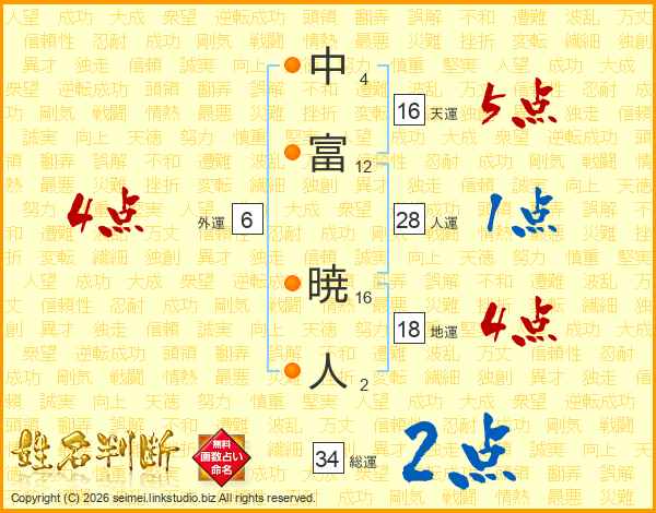 中富暁人さんの人運は28画の1点!