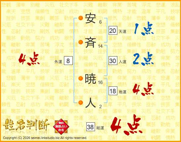 あなたの人生を表す1番重要な運勢です。生涯を通じて影響する総合運となり、主に50歳以降の晩年期に影響を及ぼします。苗字と名前の合計画数。